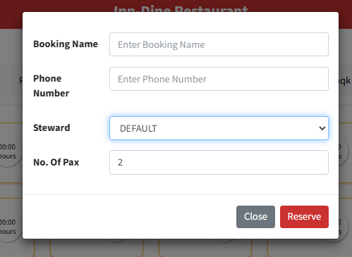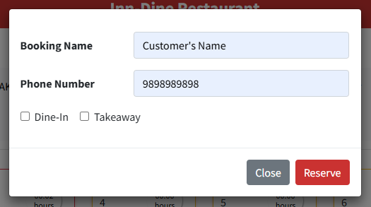Table Booking: Click on any table from any section. A form will open for the selected table in which we need to fill in the following details: